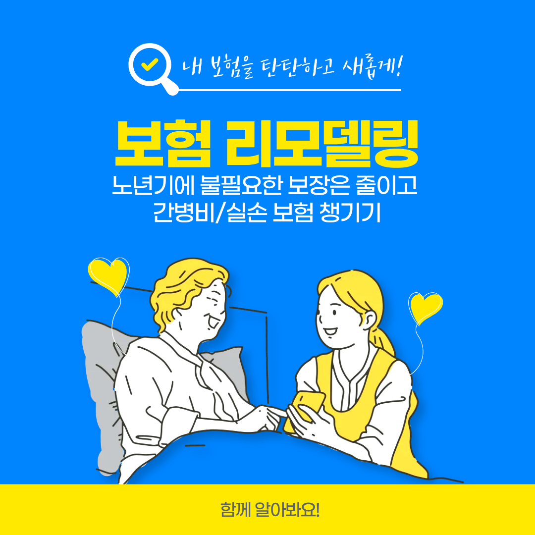 똑똑한 보험 리모델링으로 보험료 부담은 덜고, 마음의 평안은 더하는 건강한 노후 보내시길 바랍니다.